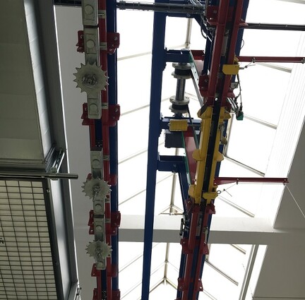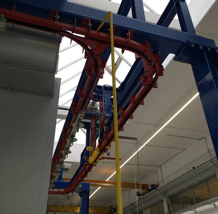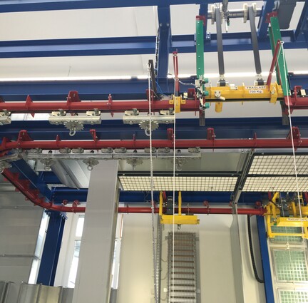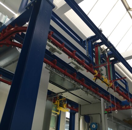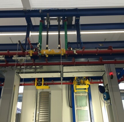 Die Aufnahme der Werkstücke in stehender Form wurde über eine Hub-Senkstation in der Fördertechnik realisiert. Werden die Werkstücke waagrecht angeliefert, so werden sie mit der Hub-Senkstation in eine senkrechte Lage gezogen. Eine Aufrichtfunktion kann für die Werkstücke über die Adapter erfolgen. Die Positionierung des Gehängewagens zur Nasslackierung erfolgt manuell und wird in der Lackierposition arretiert.