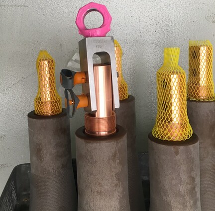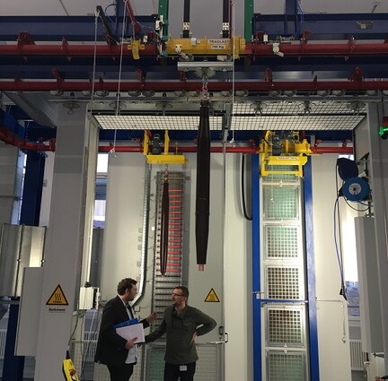 Lackiert wird an der Drehbank. Die Isolatoren, welche bis zu 8m lang sind, werden mittels Krans in eine Drehbank gehoben und entsprechend fixiert.