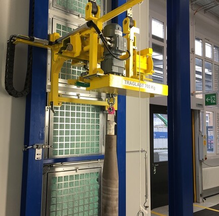 Die Abnahme erfolgt über den Hallenkran und wird in entsprechenden Bauteilaufnahmen abgelegt.